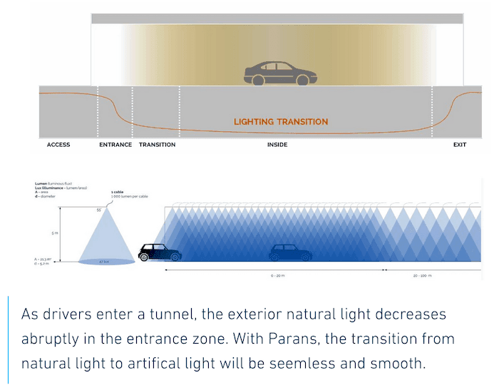 We’re designing a Parans lighting array to facilitate a smooth transition for drivers entering the tunnel. As a driver entering a tunnel from the outside, you’re going into this sort of black hole, and sometimes that can create a lot of contrast, which could restrict visibility and result in accidents. You really need sufficient light when entering that first part of the tunnel to maintain visibility and safety. So we’re going to combine artificial light with natural daylight from Parans to match the light conditions inside and outside the tunnel- reducing the contrast while traveling between zones, making transit safer for drivers, and hopefully reducing accidents in that area.