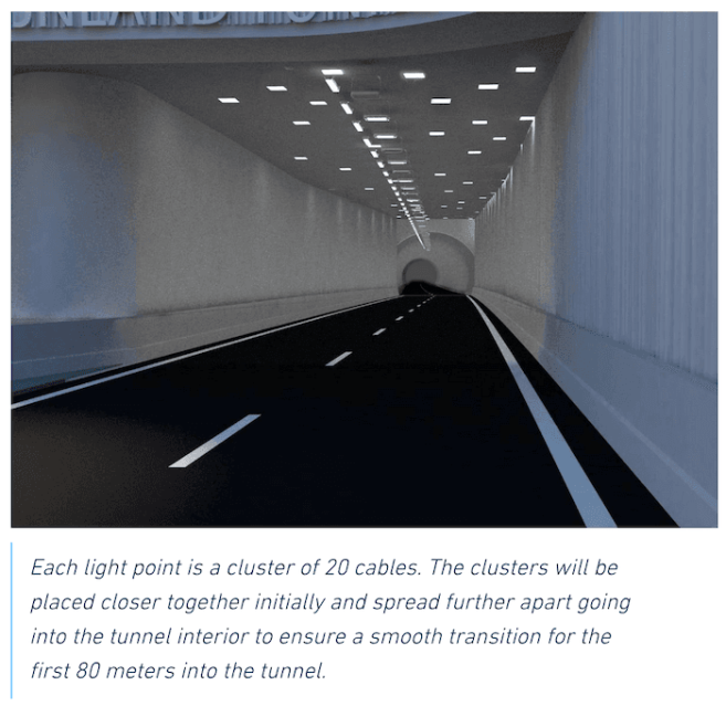We are clustering about 20 cables of light into each luminaire and fading the cables out as they move from the entrance where the light is more intense. It’s a fading design where the luminaire proximity decreases as you enter the tunnel to adjust for the transition.